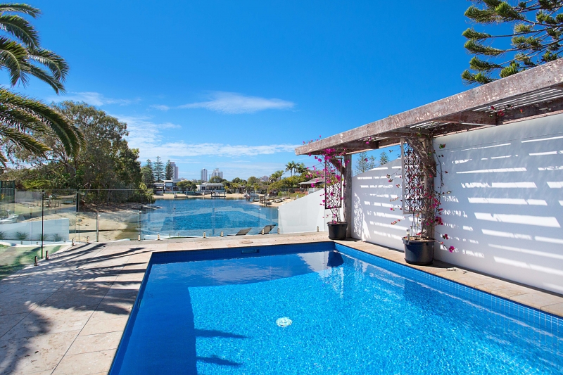 This coastal styled holiday home has been crafted to create a sense of relaxed well being in Broadbeach Waters surrounds. All on one level with fantastic indoor outdoor flow the soaring ceilings, polished floors and chandeliers create an amazing ambiance.